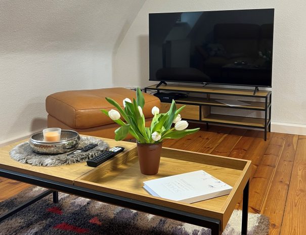 - Wohnzimmer mit TV und Blick auf den Heiligen See